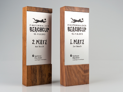 In jedem Jahr wird für die Teilnehmer am Finsterwalder Beach-Cup ein neues Shirt-Motiv entworfen. Es basiert auf handgezeichneten Grafiken und zeigt die Dynamik des Spiel in seinen zahlreichen Facetten. Bei den Volleyballern sind sie sehr beliebt und begehrt. Neben den stylischen Shirts sorgen auch die originellen Pokale für großes Interesse und zahlreiche Anmeldungen zum Finsterwalder Beach-Cup. Die Holzpokale mit gebürsteten und gelaserten Aluminium-Einlagen wurden ebenfalls von den Piktografen entworfen und vor Ort in Finsterwalde hergestellt.
