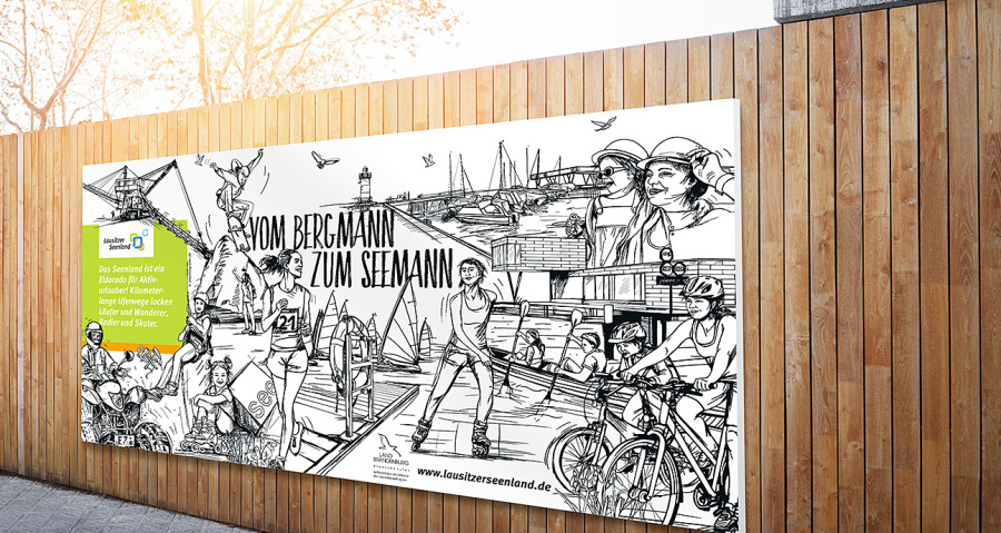 Mit Genauigkeit und Sorgfalt bei der Erstellung der Illustrationen, mit Hilfe und Beratung des Traditionsverein Braunkohle Senftenberg e.V., sind mehr als 200 Einzelbilder entstanden, die – kreativ zusammengestellt – verschiedene Themeninseln abdecken können und in einem erzählerischen Stil neugierig auf die Geschichten machen. In dem 24-seitiges Malbuch, welches den Grundschulen als Lehrmaterial zur Verfügung gestellt wird, nähert man sich spielerisch und malerisch dem Wandel der Landschaft, im Kapitel „Krabat und die Sorben“ wird auf die Urahnen der Lausitz verwiesen. In Gastronomieeinrichtungen der Region stehen den Kindern zwei Malvorlagen im A3-Format zur unterhaltsamen Gestaltung zur Verfügung. Mit der Kampagne im erzählenden, illustrativen Stil schaffen wir darüber hinaus Möglichkeiten für neue Anforderungen und erzielen dadurch eine Langzeitwirkung, die erwünscht ist. Die Nachhaltigkeit ist wesentlich höher als bei anderen Aktionen.