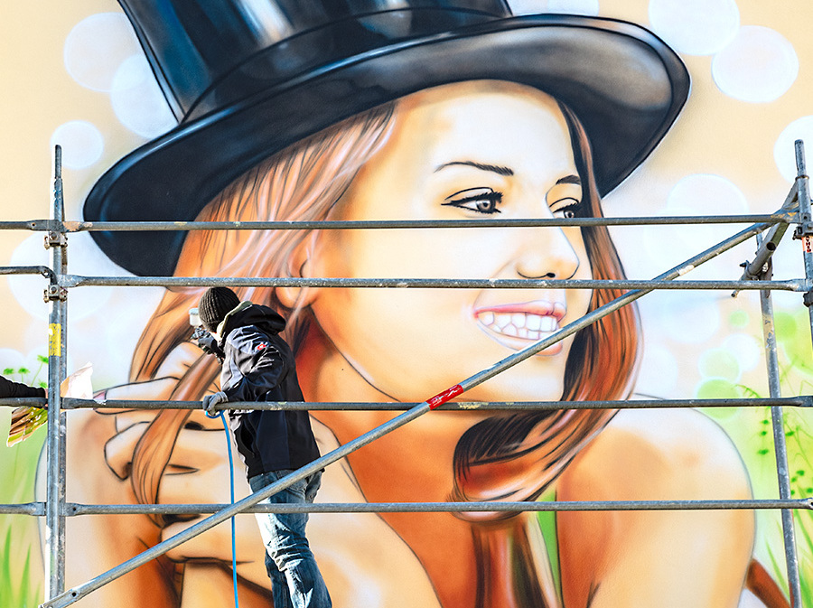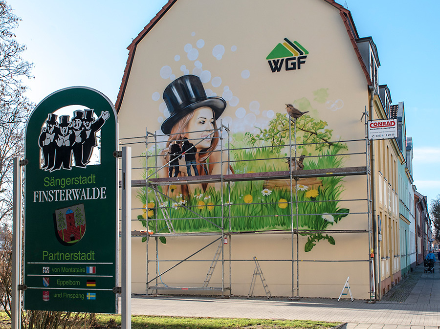 Direkt an der östlichen Einfahrt zur Sängerstadt in der Cottbuser Straße von Finsterwalde wurde der Giebel eine Wohnhauses der WGF mit einer jugendlich frischen Interpretation der Sängertradition verschönert. Aus Richtung Cottbus kommend begrüßt den Gast der Sängerstadt eine fröhlich beschwingte Bildkomposition, die wohl jedem ein Lächeln ins Gesicht zaubert.